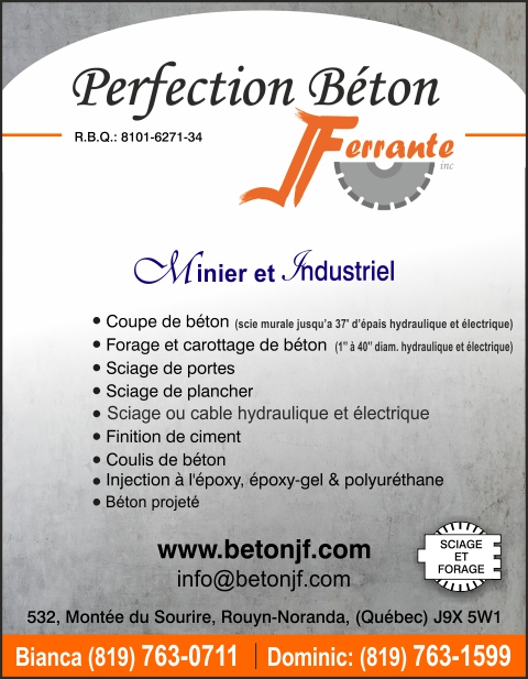 Quels que soient vos projets ou besoins en terme de produits et services, vous trouverez en PERFECTION BÉTON JF INC un partenaire de confiance reconnu pour son approche professionnelle et son efficacité. Nous sommes des experts en Béton (Finition), Béton: Sciage - Forage, .